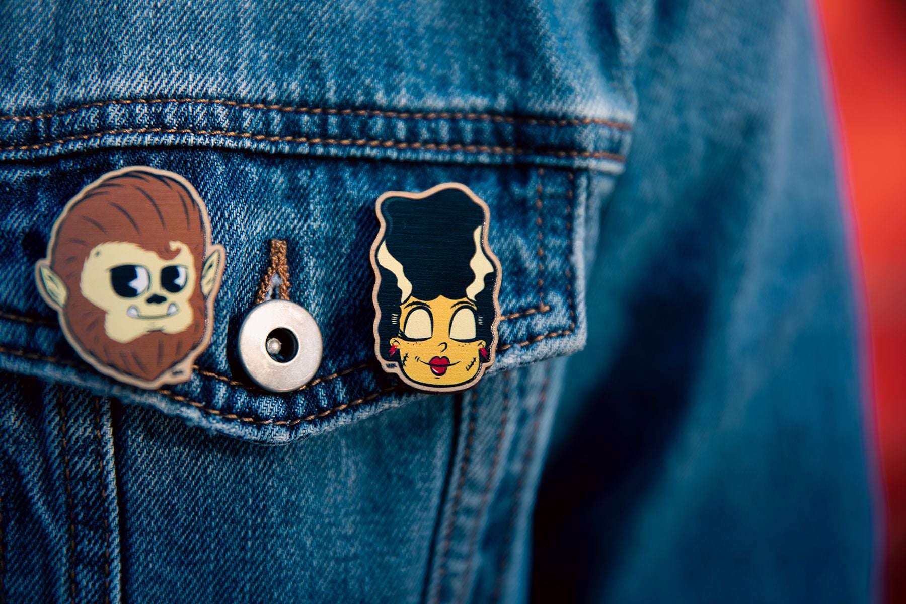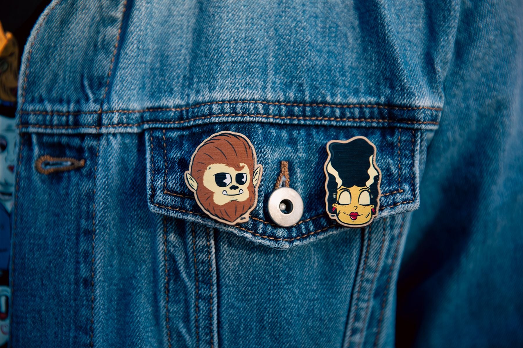 Prepare for a collection that's monstrously cute. Our wooden pin set is unlike anything you have seen. The charming bride pin with her sweet smile will steal your heart. Our rockabilly werewolf pin is howling with his slick hair. He's ready to howl his way to your collection.