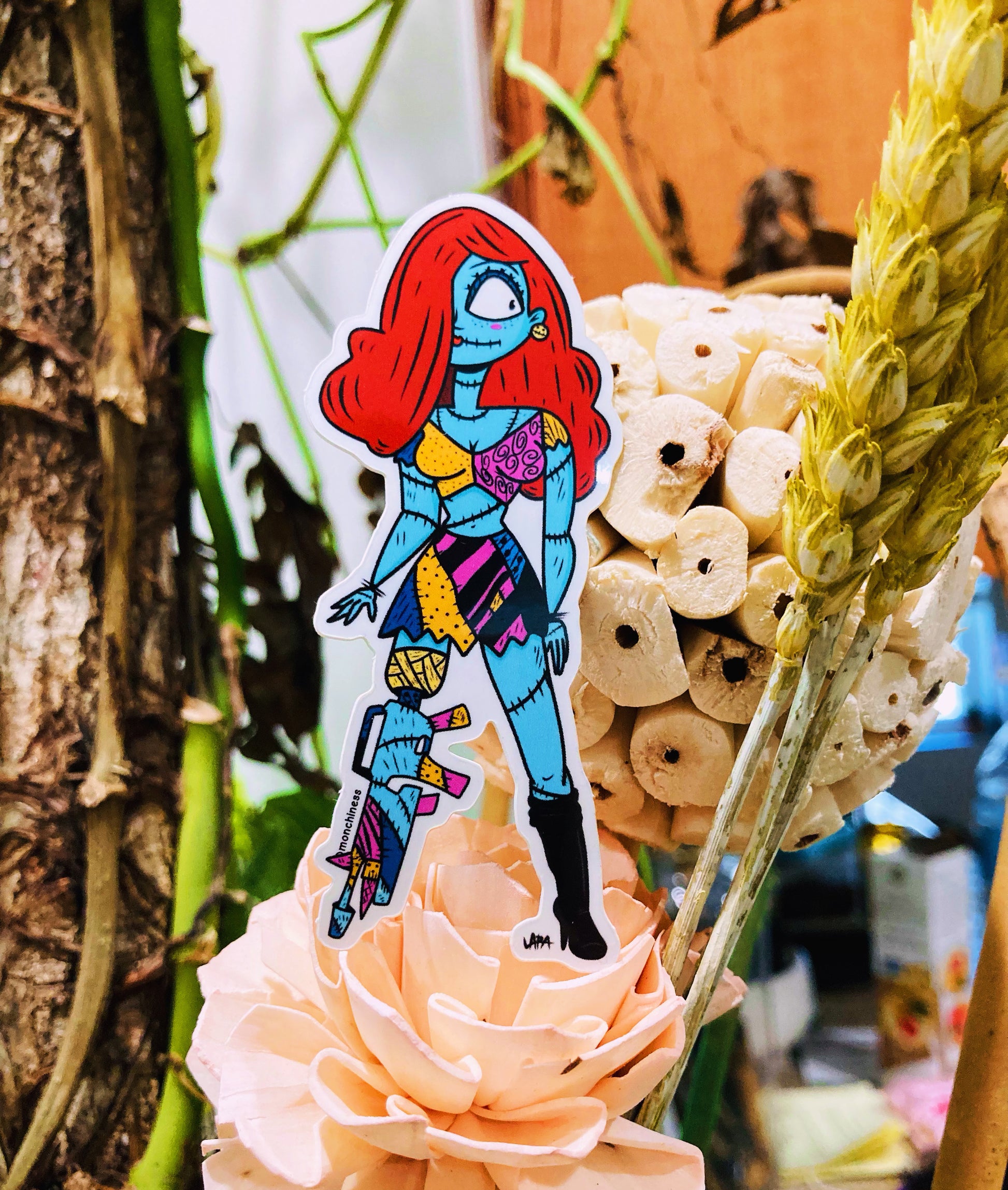 Introducing our Cherry Sally, a darling with a twist. It's inspired by the 2007 film Planet Terror. Cherry Sally is not your average girl. She's smart, colorful, and strong. She lost a leg, but don't feel bad for her. She replaced it with something way more awesome. She's a cute and terrifying combination that you won't find anywhere else.