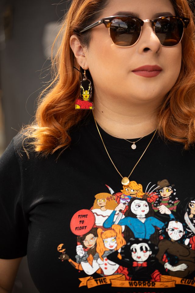 The Queens of Scream Reign! The Horror Club shirt is not your average horror t-shirt. We have twisted things up by reimagining iconic male characters as fierce females. It's an all women Horror Club and these ladies of fright are ready to slash your style and make your look float with chillingly unique charm with a scream.