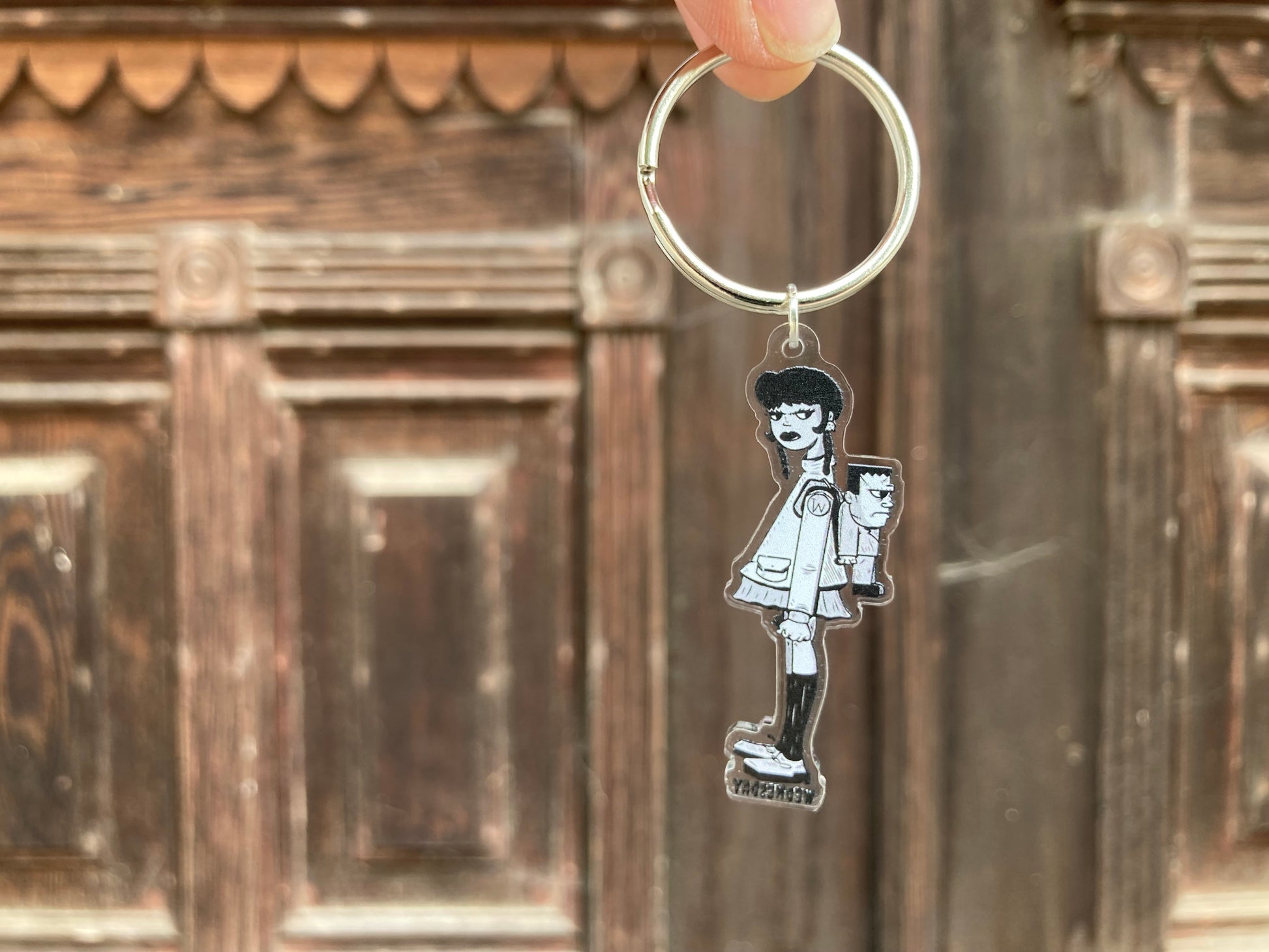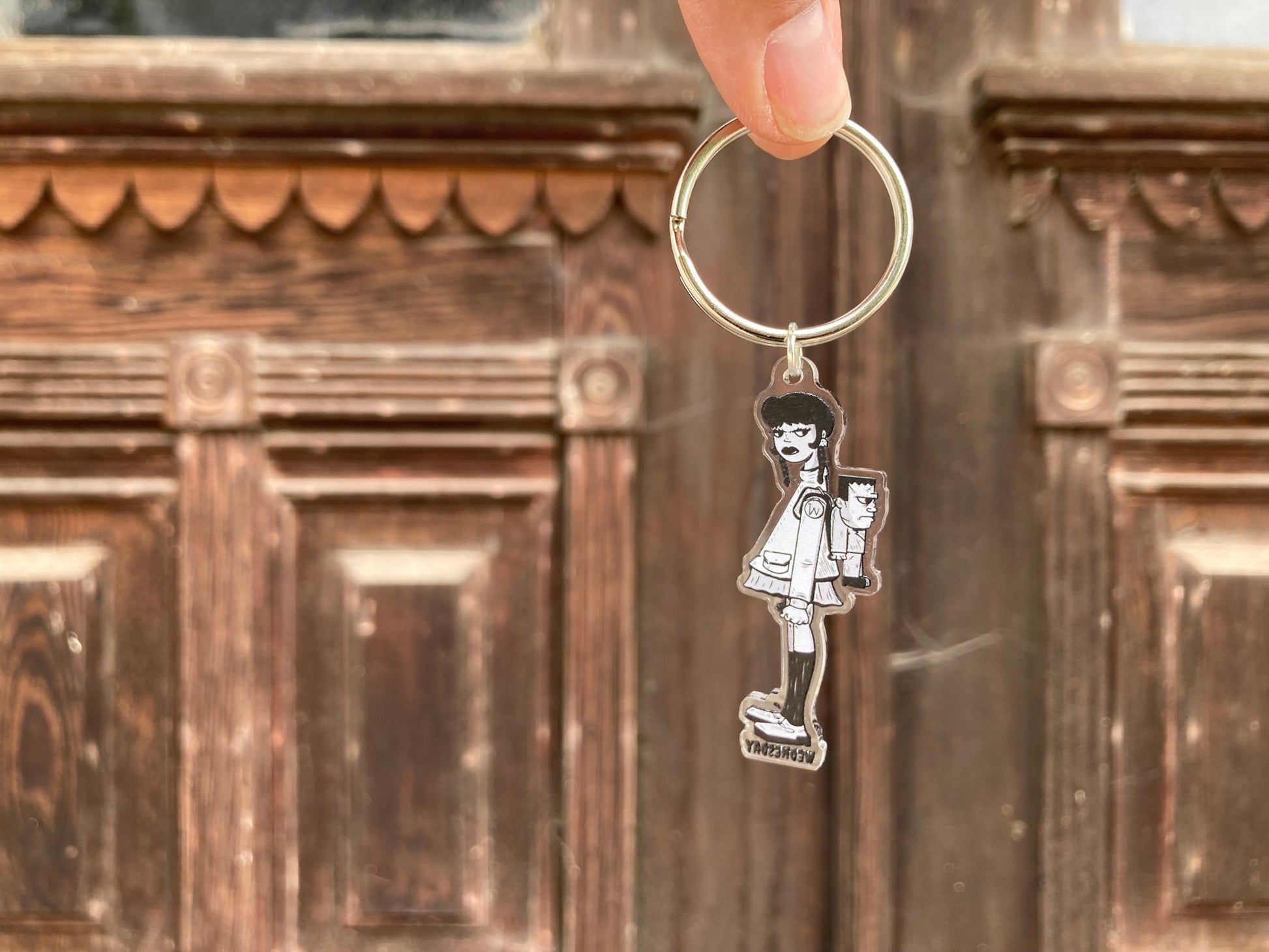 You won't catch her smiling or breaking character. She's all about that deadpan look. Check out her monster backpack. We're pretty sure she might have spider crawling in there. Just remember, always be a good friend to Wednesday and she will ass a little delightfully dark charm to your day.