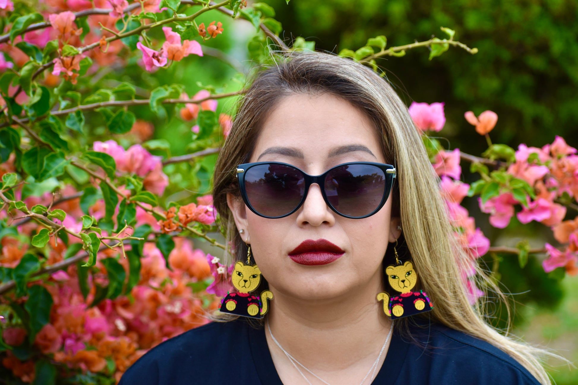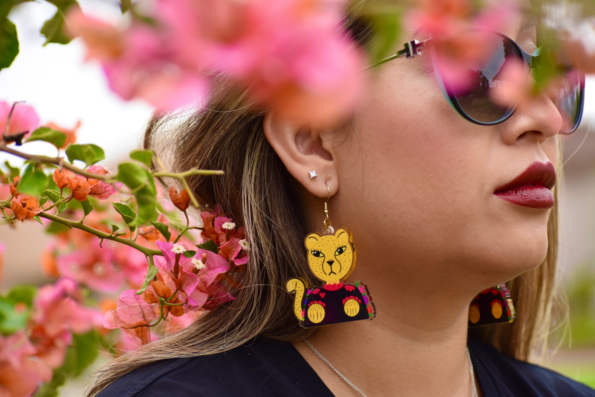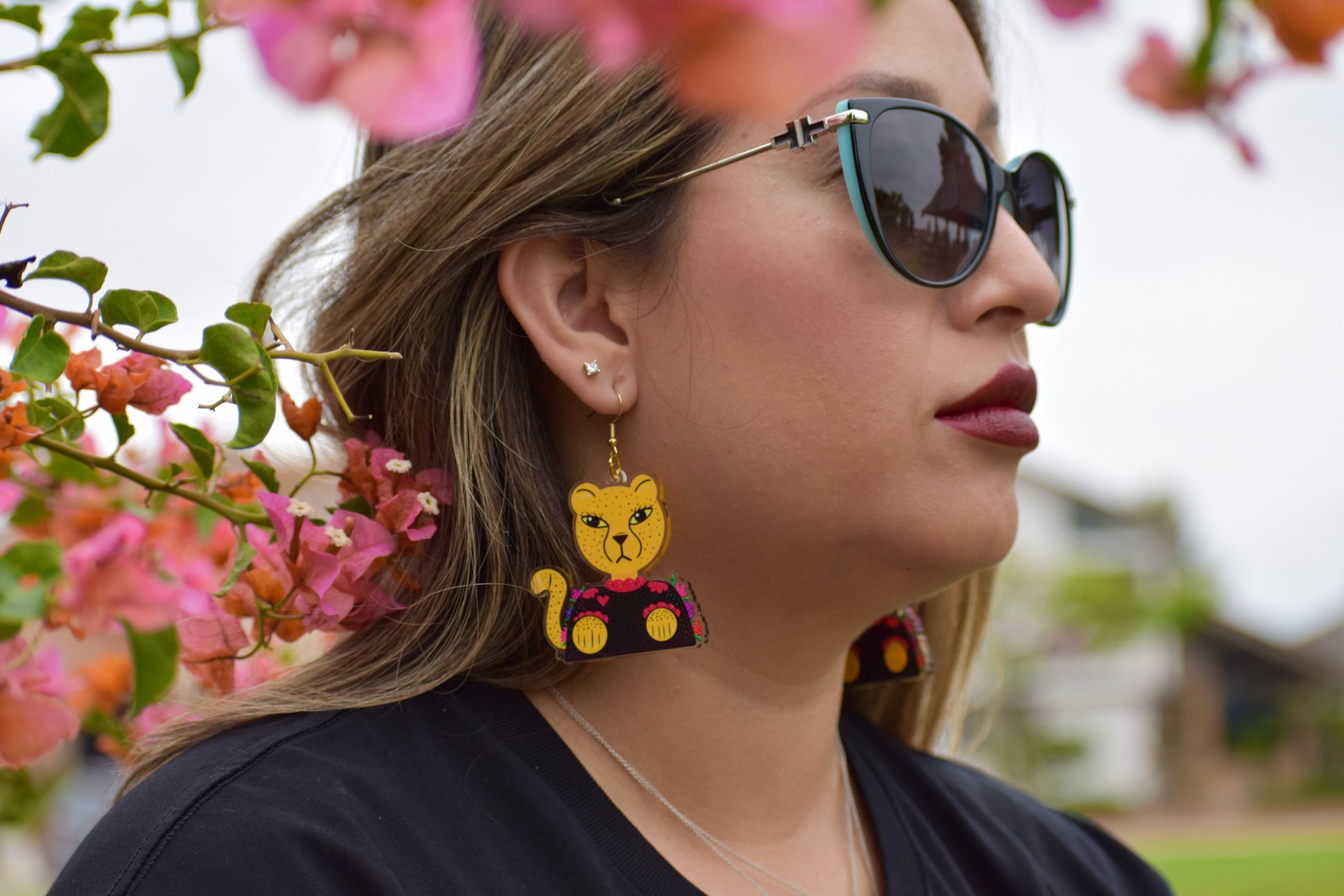 Get ready to turn heads with our lovely cheetah earrings. She's rocking her floral black sweater. She's looking fancy today. She's dressed to impress.