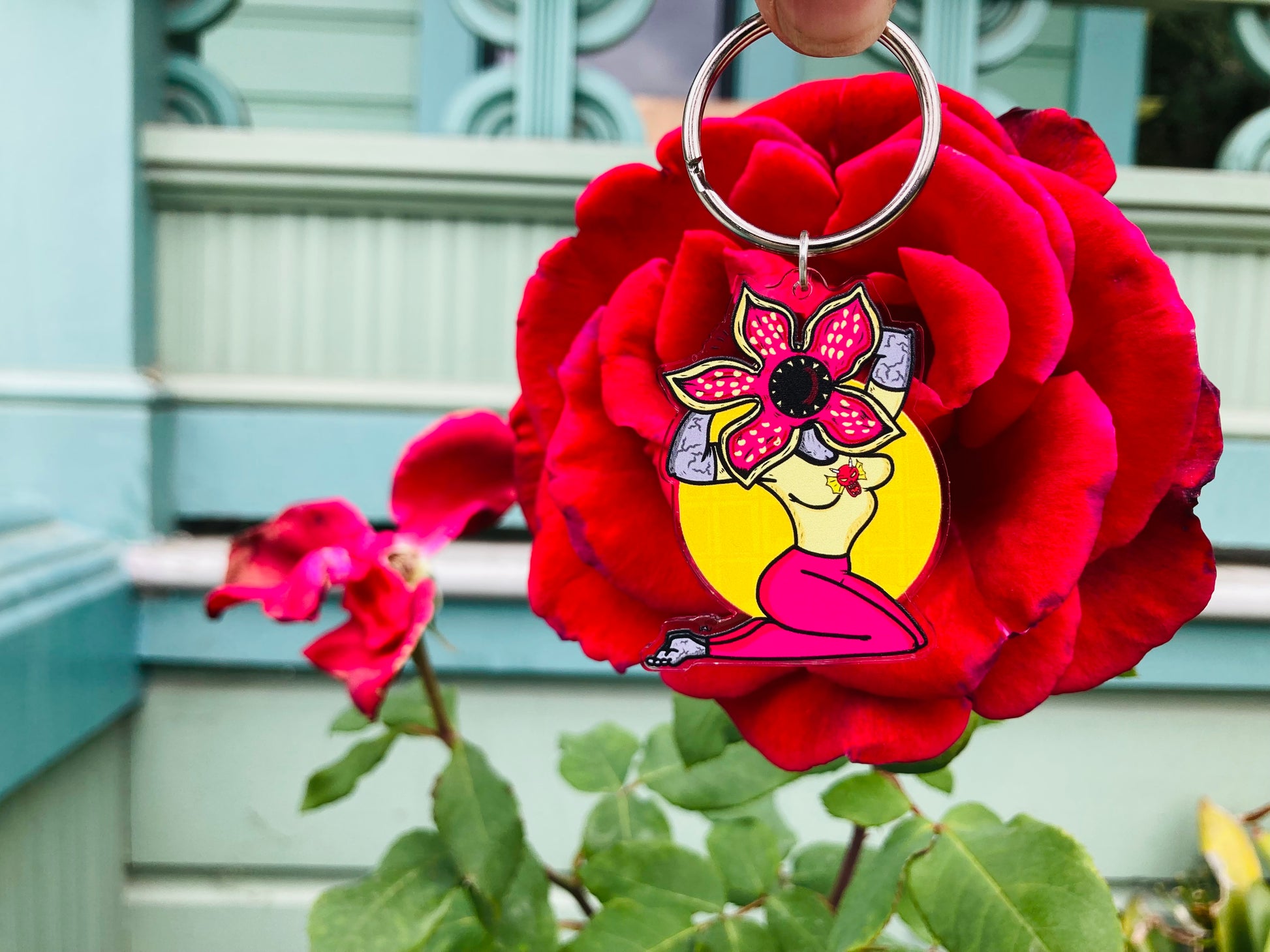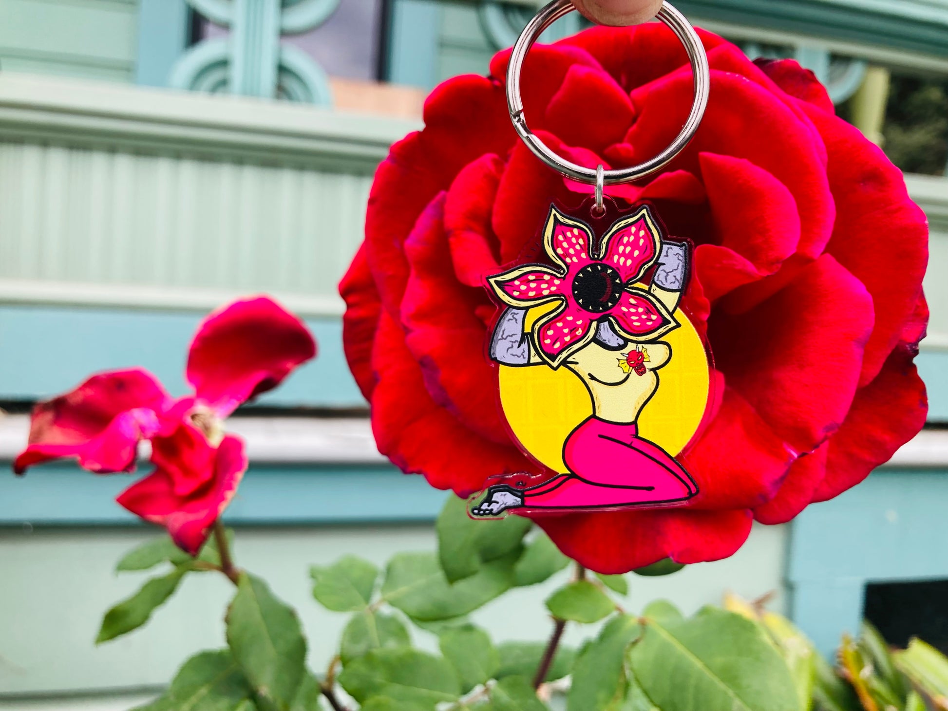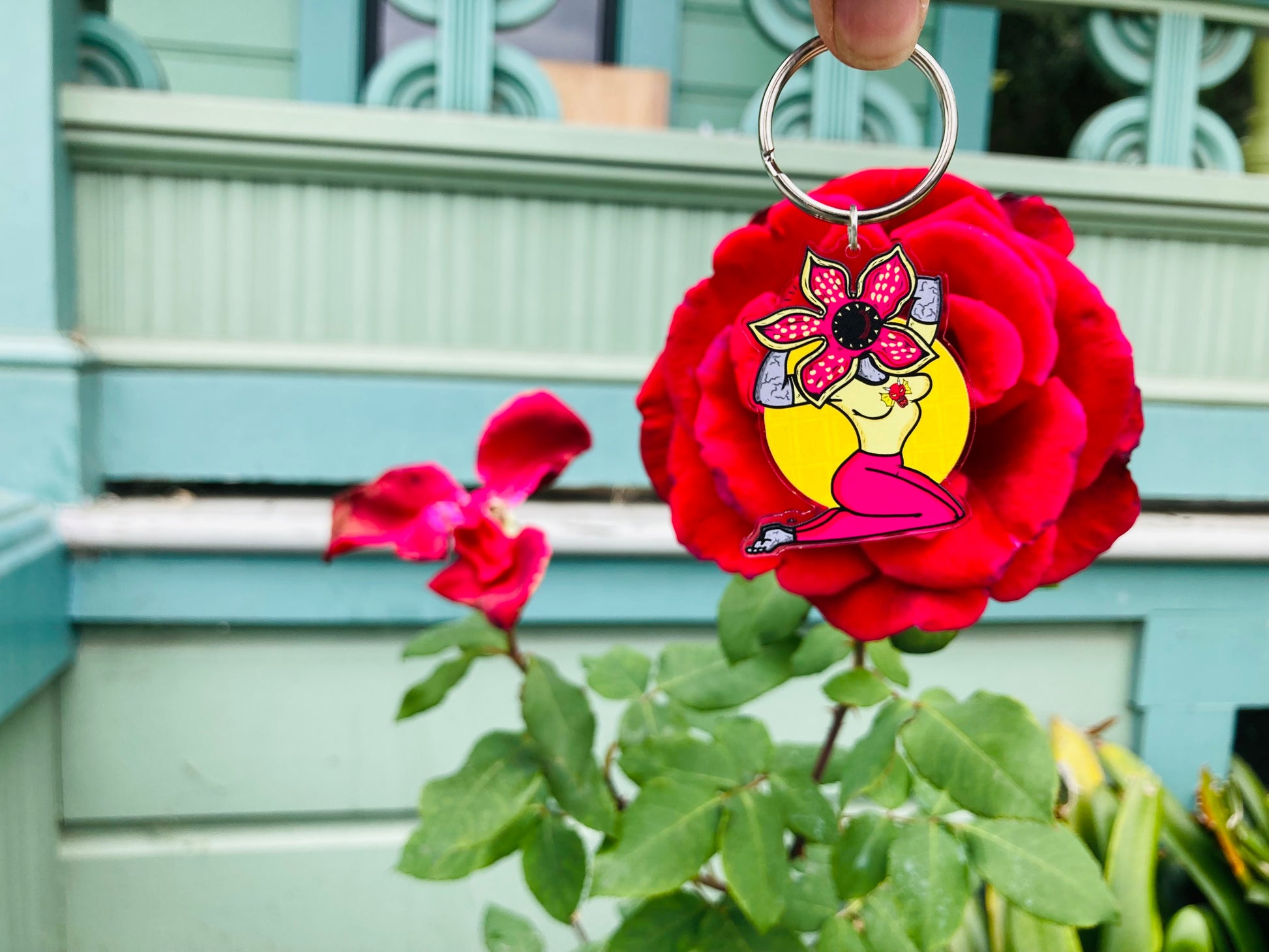 She's a beautiful horror who's truly a scream. Don't let her stunning looks fool you. She bites. What's that waffle behind her? That's a sweet mystery for you to ponder. This versatile keychain can spruce up your keys, backpack, and even serve as a unique zipper pull.