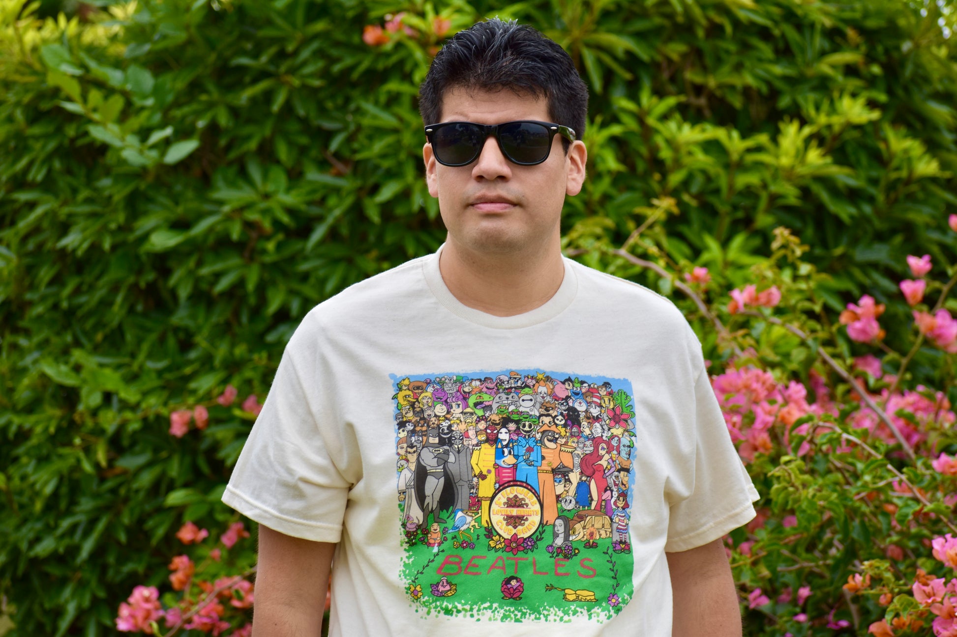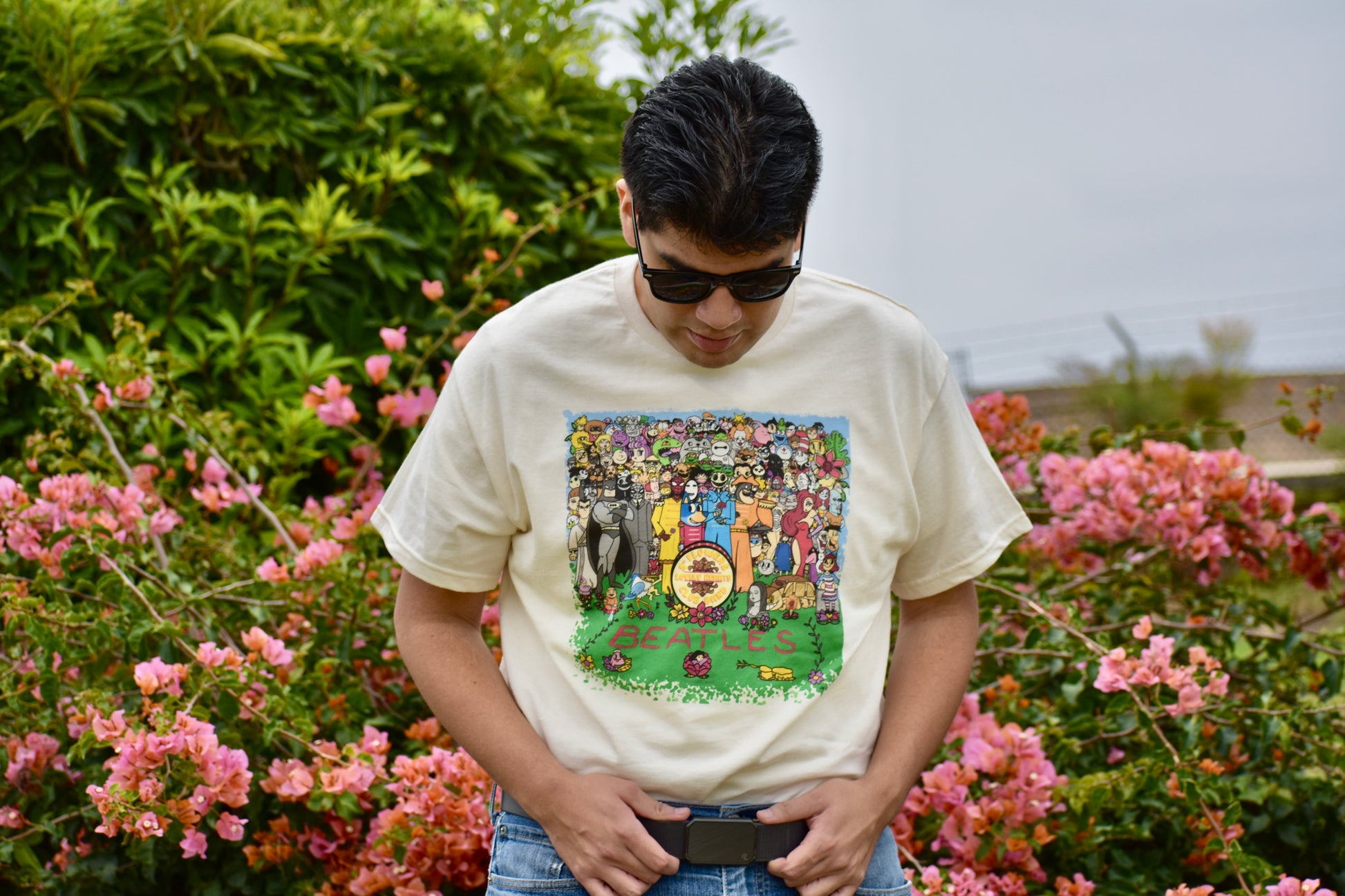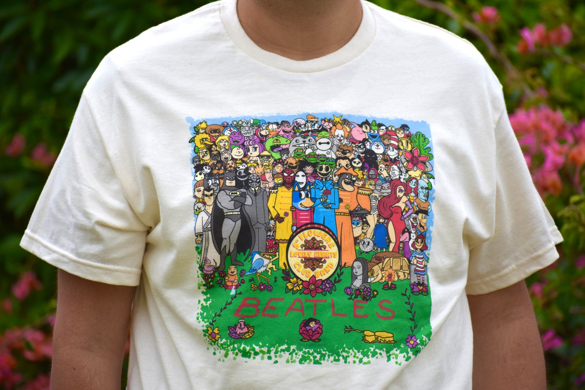 Get ready to fall in love with our Sgt. Flower's Lovely Heart Club Band shirt. It's our first cream color shirt. This vibrant design is our heartfelt homage to The Beatles' iconic album with a whimsical twist. It took over three months to bring this design to life. It features more than 100 unique characters.