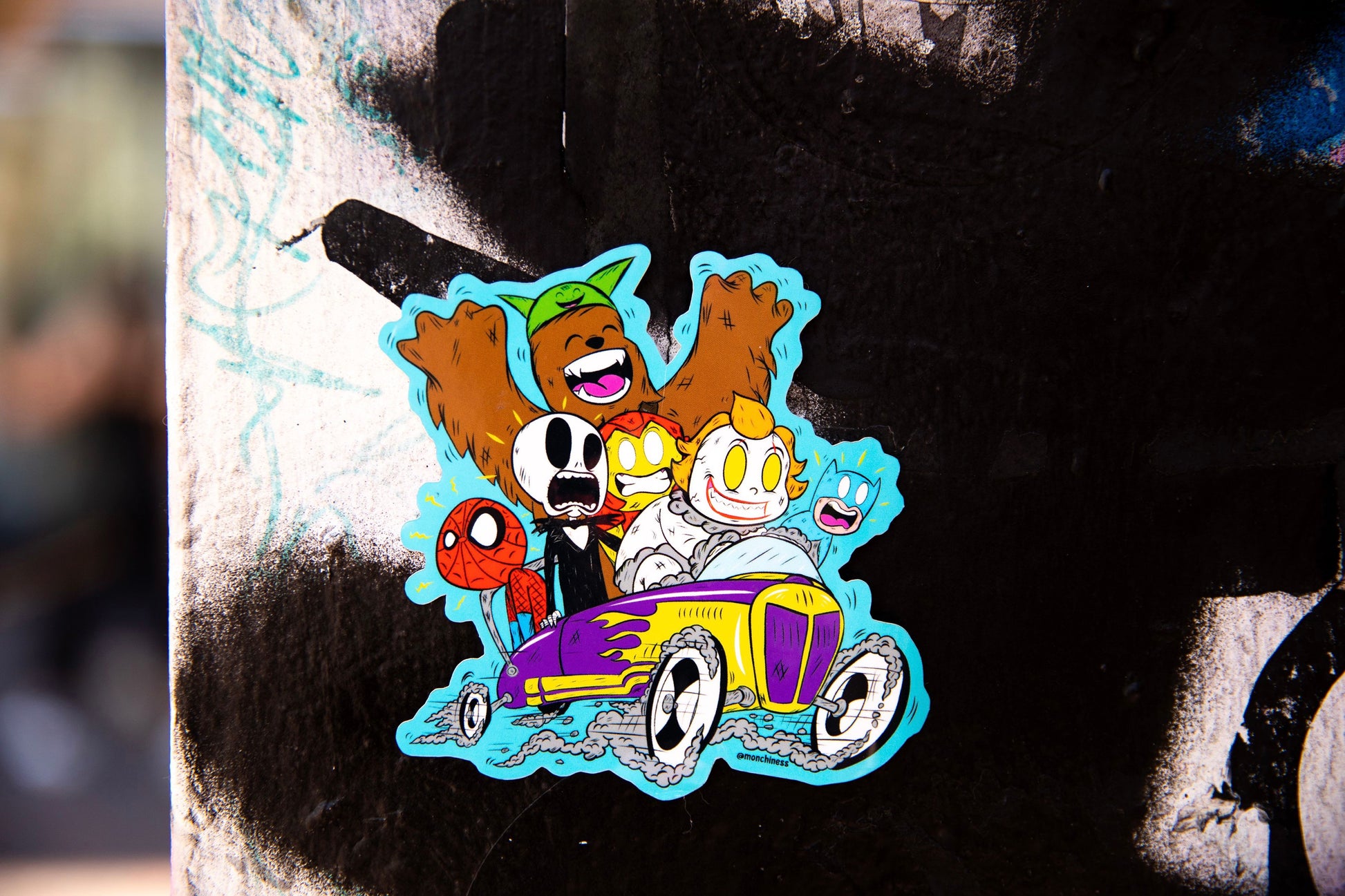 They're ready for a spin. Six iconic character piled into a purple and yellow hot rod. For some reason, they let a clown take the wheel and hit the gas. The sticker captures a wild road trip that's sure to be full of twists and turns.