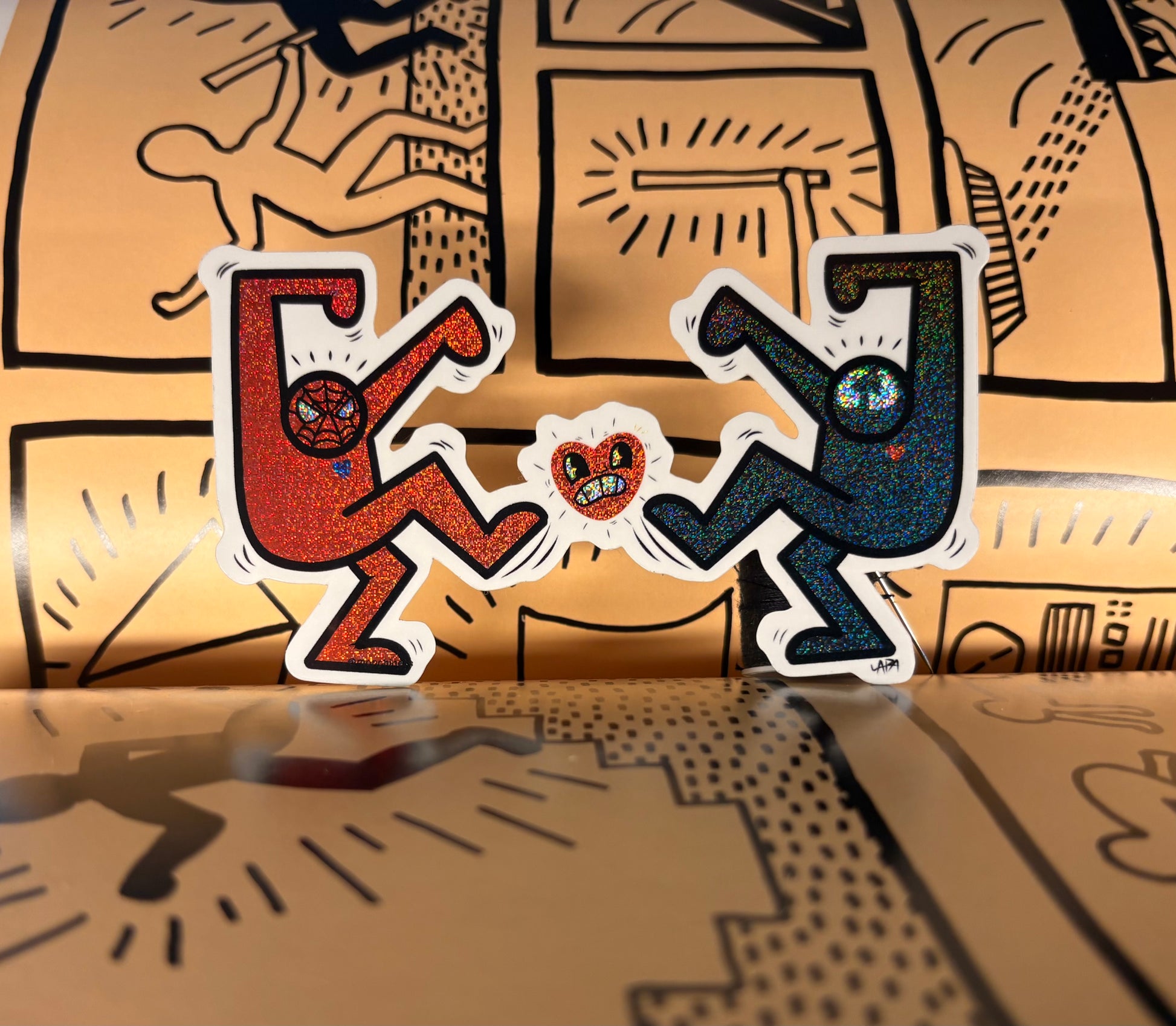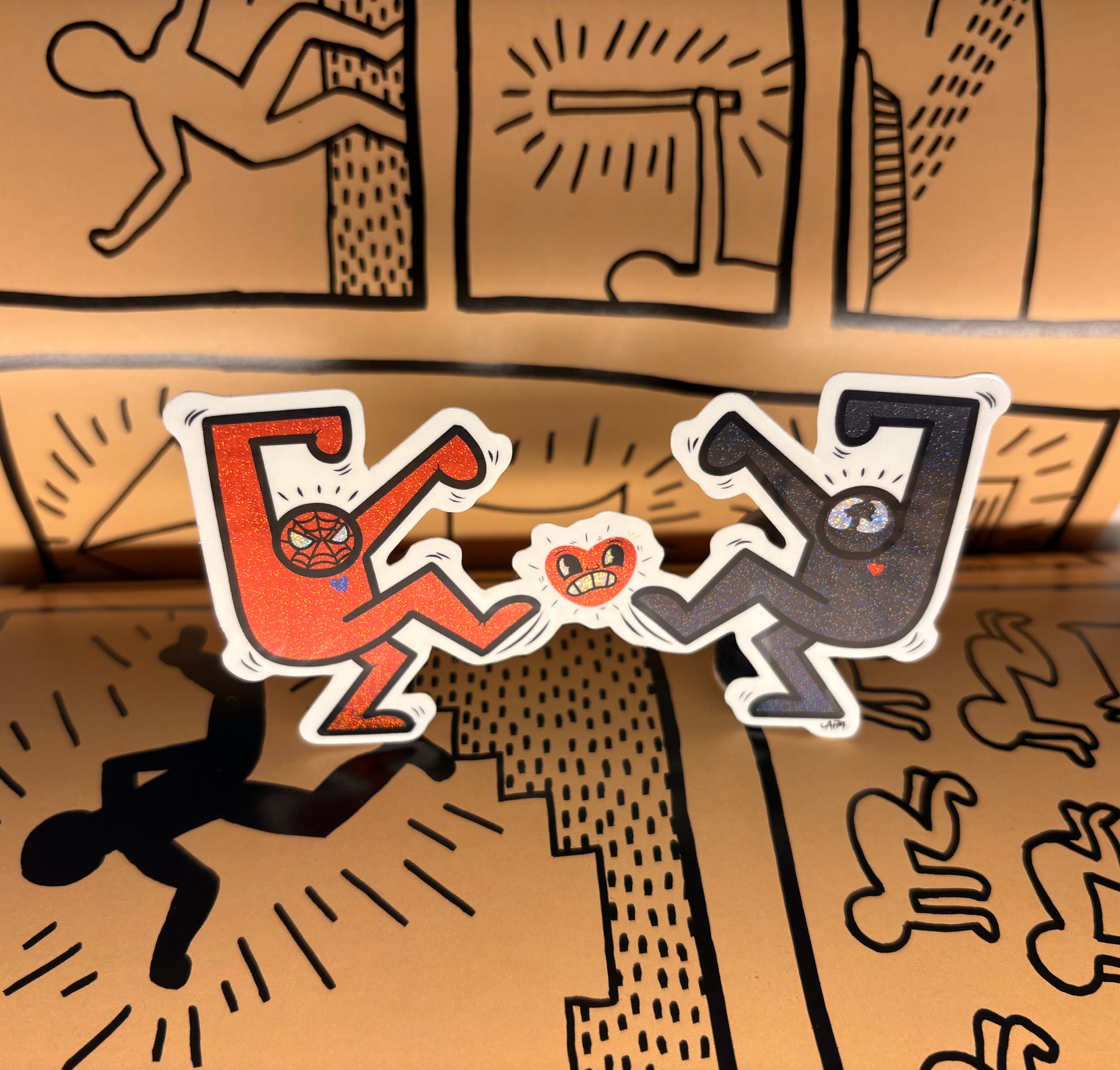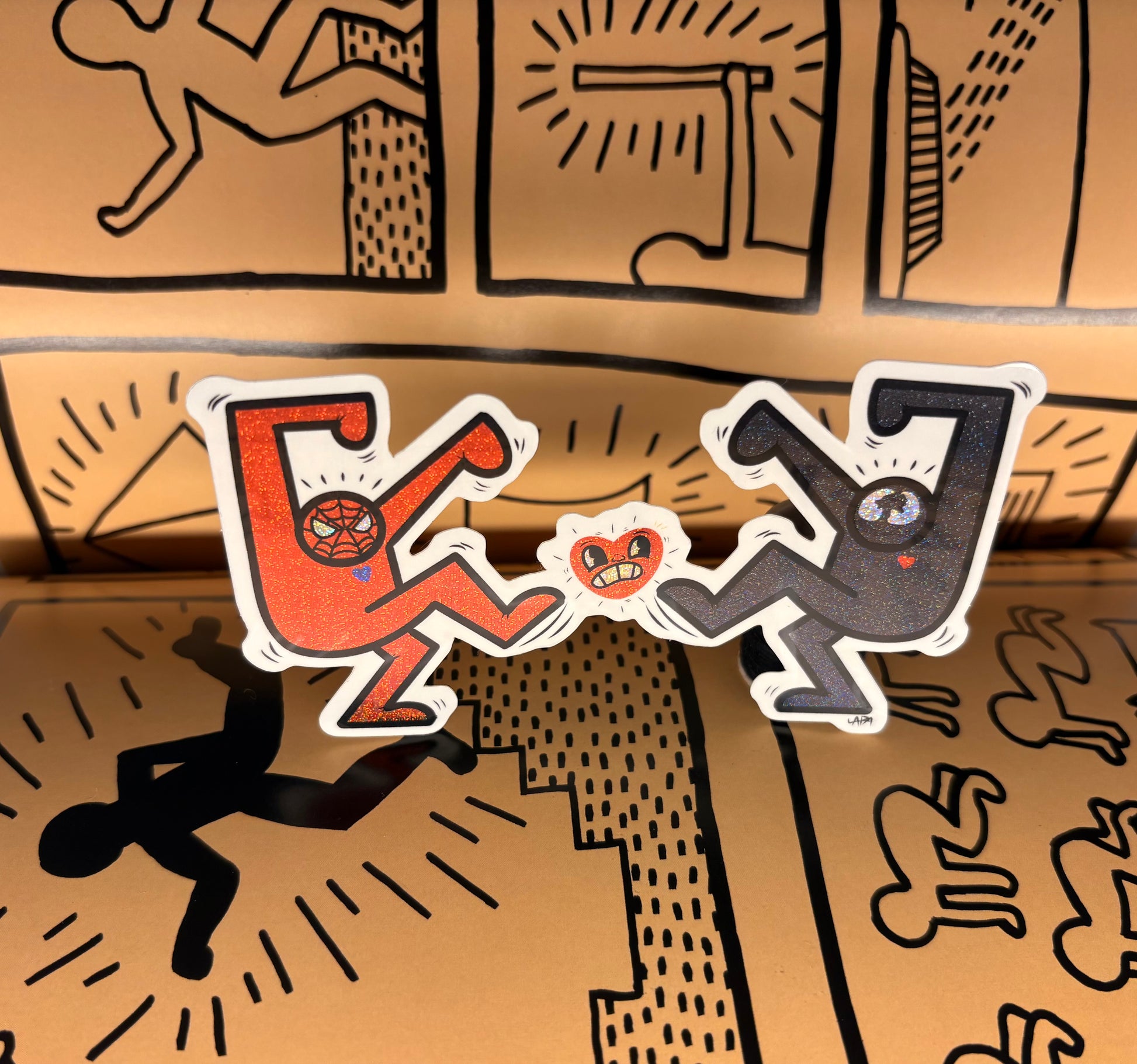 Two worlds collide in our Spidey vs Venom glitter sticker. It's inspired by the iconic pop art of Keith Haring. This glittering sticker captures the epic rivalry between two icons. It's an eye catching style for fans of both heroes.