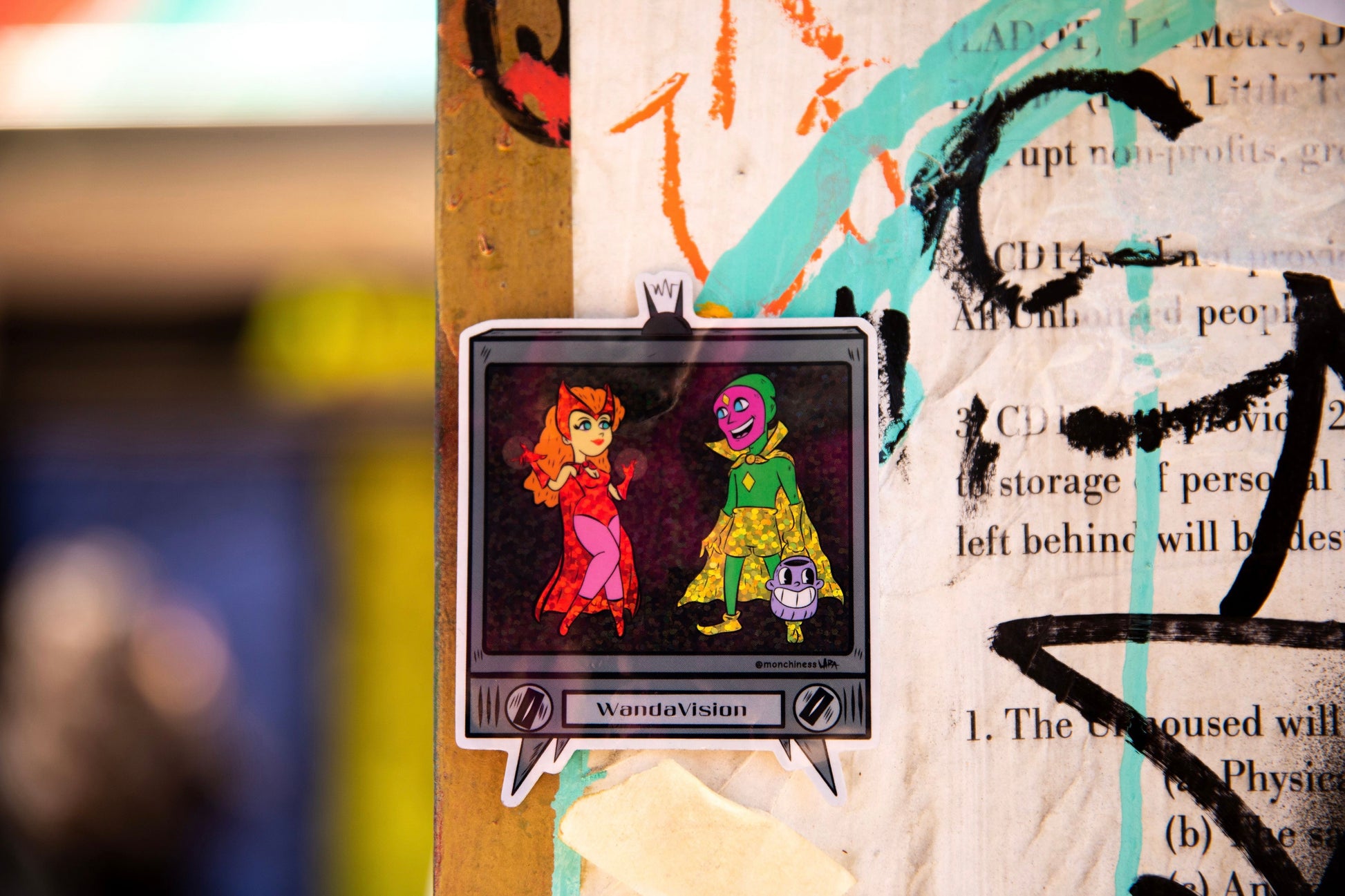Add a little sparkle to your spooky season with this adorable WandaVision sticker. The lovable couple is dressed up for a Halloween celebration. It's completed with glitter that shines day and night. Take a closer look and you'll spot Vision holding a clever little candy bucket.